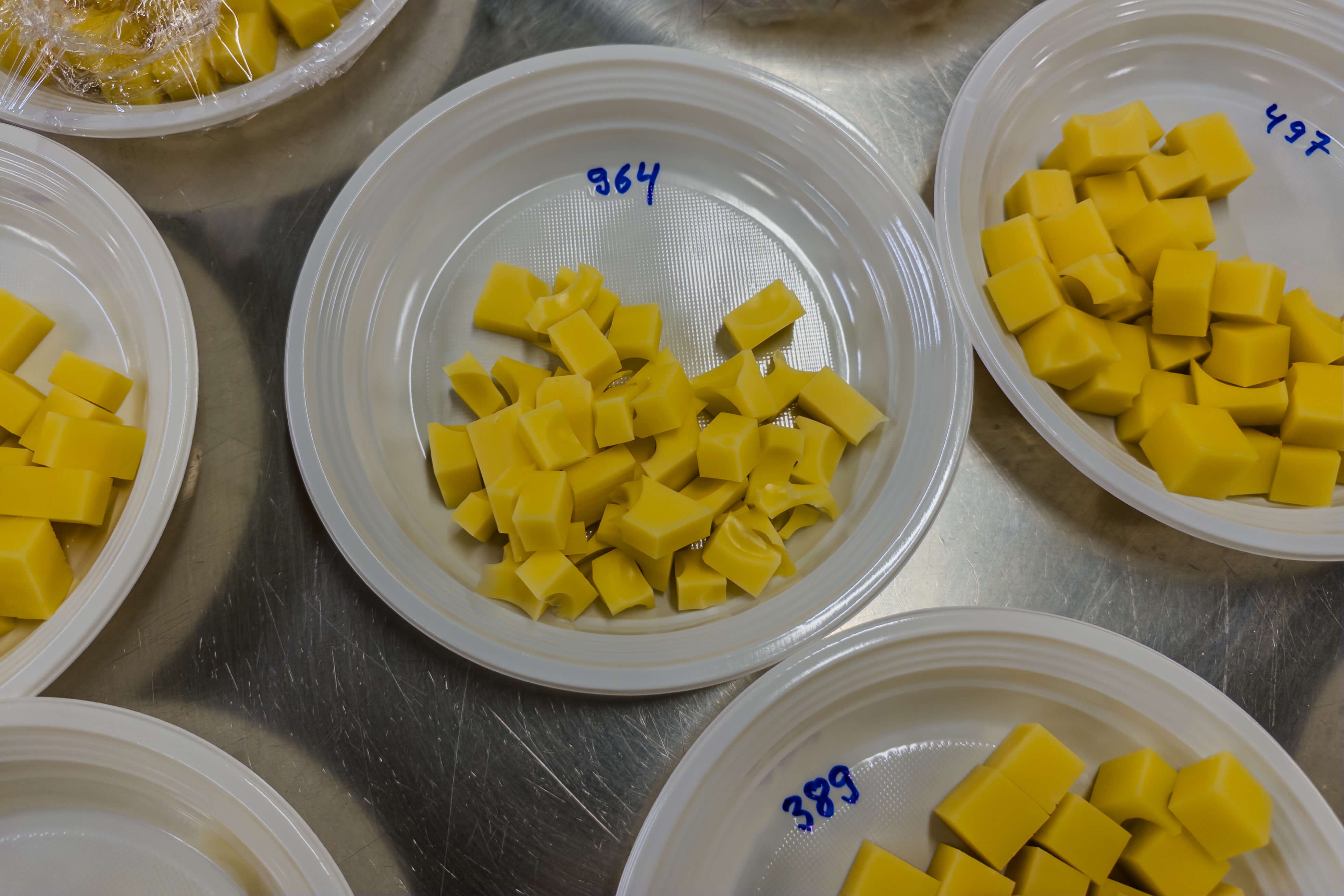 Für die Degustation liegen gleichmässig geschnittene Käsewürfel von 16 Versuchs-Laiben in anonymisierten Plastiktellern. Die Forschungsgruppe beurteilt akribisch die sensorischen Eindrücke.
